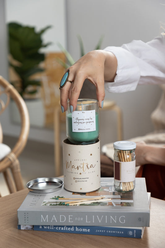 Velas aromáticas de cera color verde en esencia pino, con mensaje