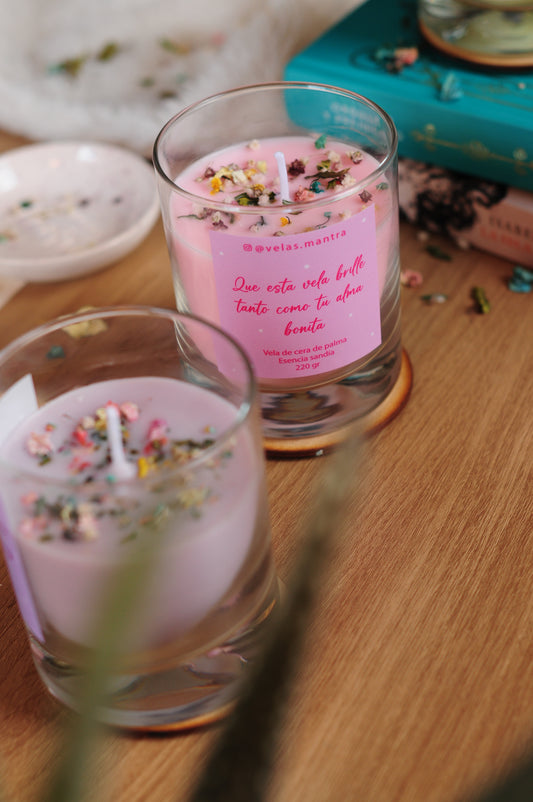 Velas aromáticas de cera color rosa en esencia sandía, con mensajes