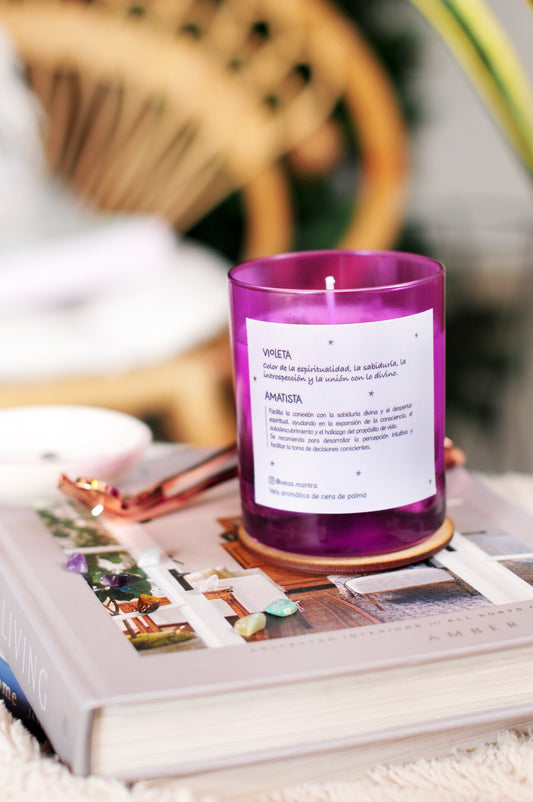 Velas aromáticas de cera color lila en esencia uva, con mensajes