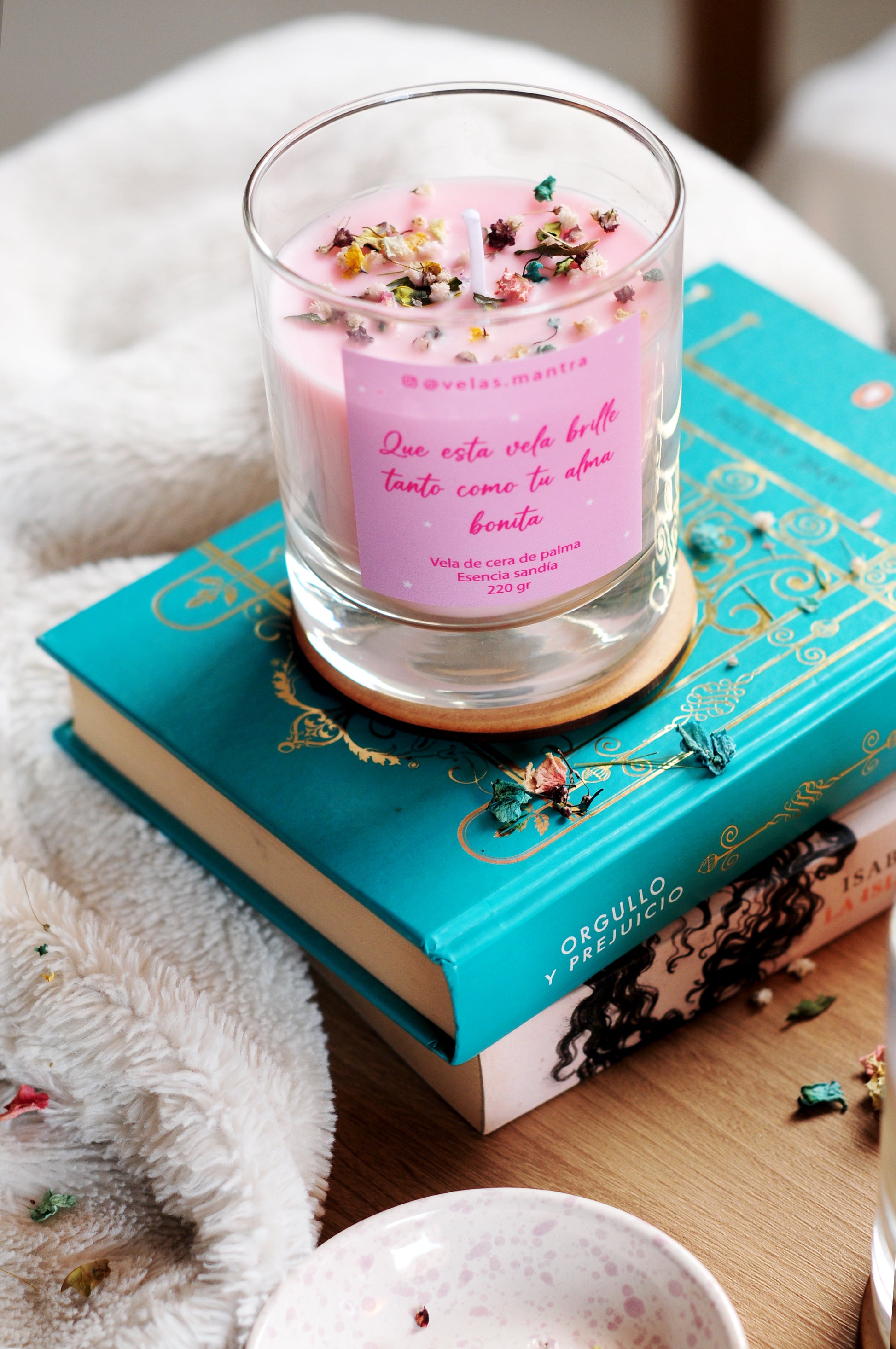 Velas aromática de 1 mecha, hecha en cera de palma de color rosado, esencia para aromaterapia de sandía y pabilo 100% de algodón, vaciadas en envases de cristal transparente, con mensaje: Que testa vela brille tanto como tu alma bonita. Incluye tapa en mdf.