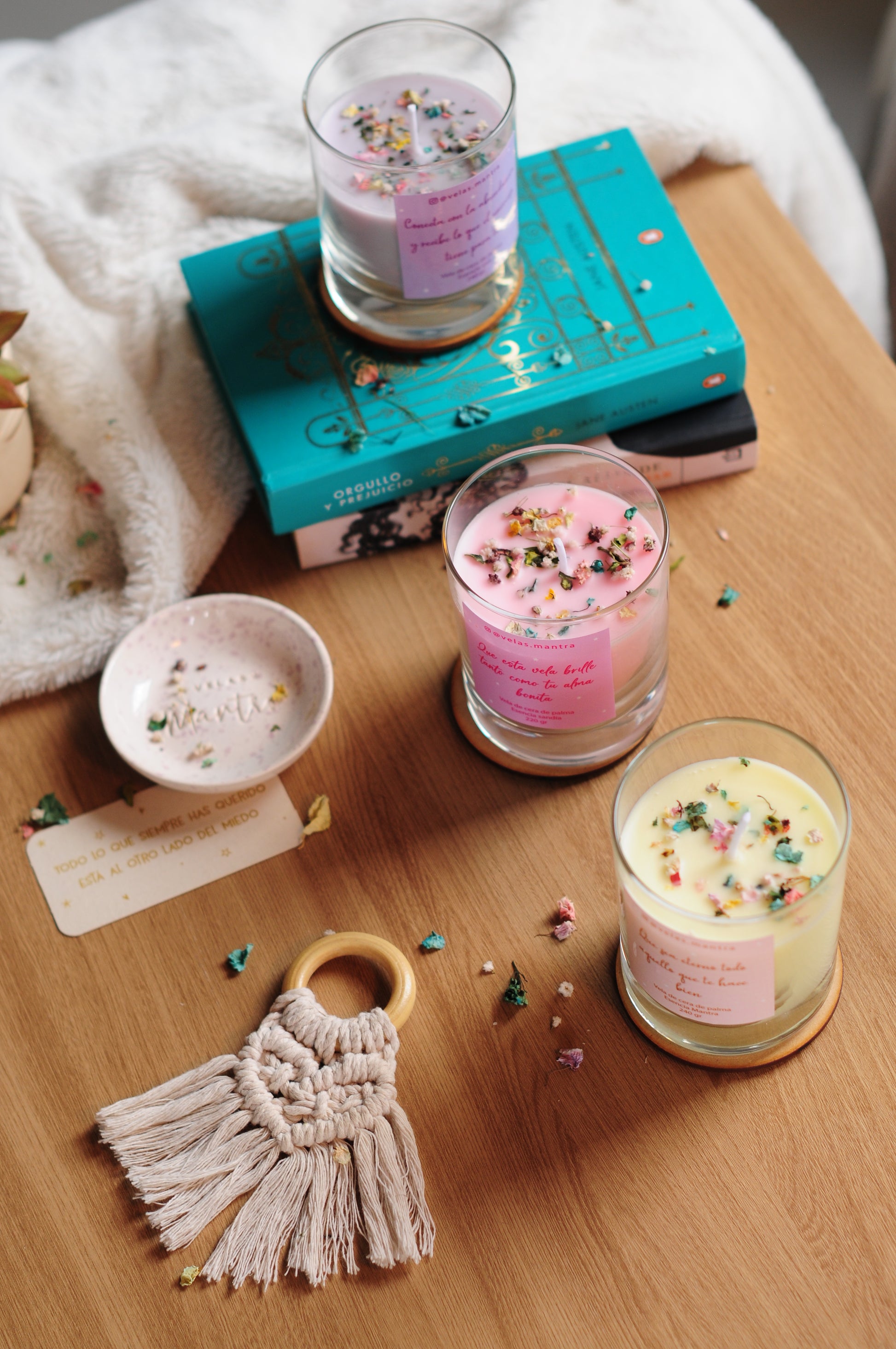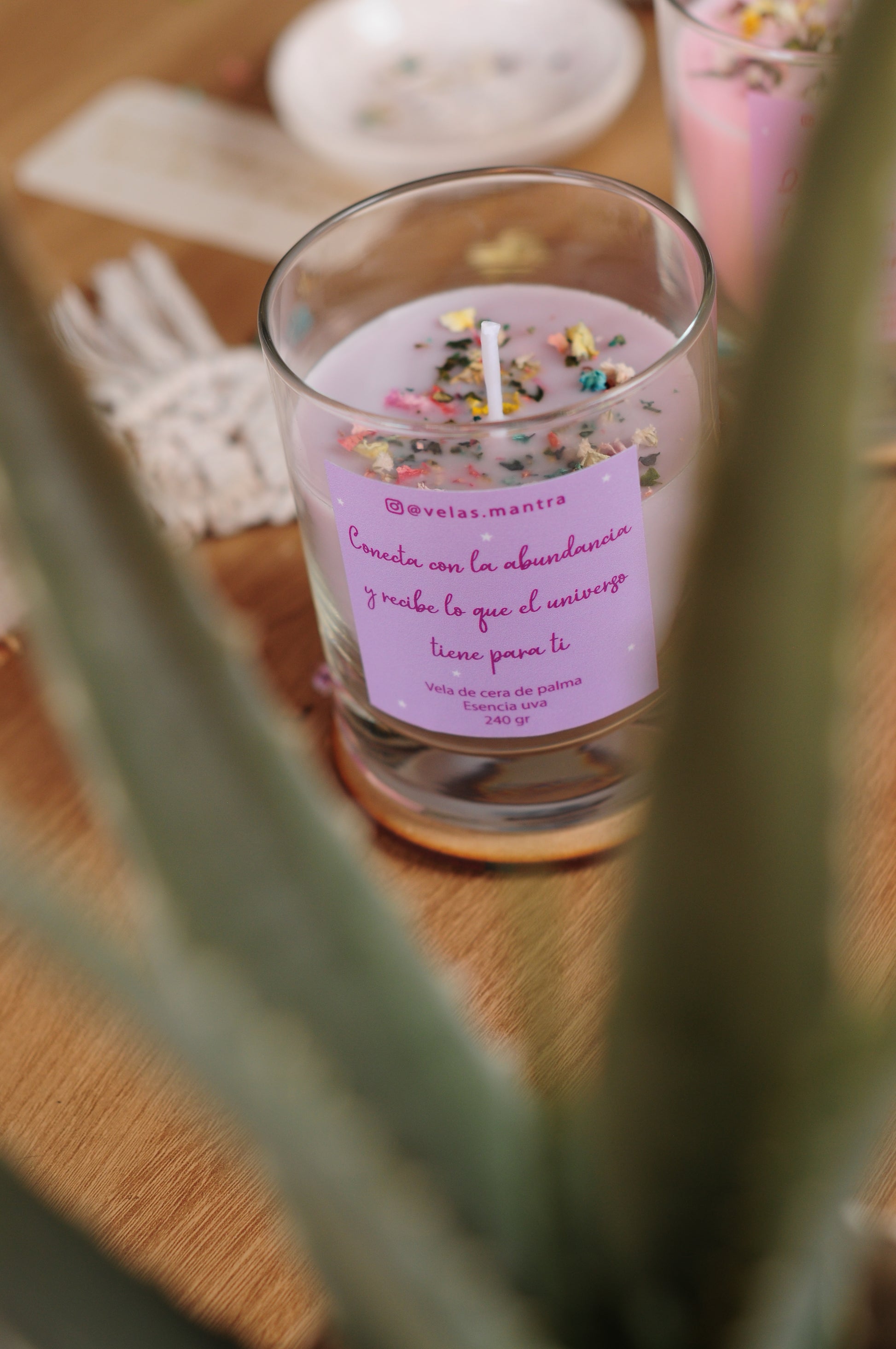 Velas aromática de 1 mecha, hecha en cera de palma de color lila, esencia para aromaterapia de uva, toques florales y pabilo 100% de algodón, vaciadas en envases de cristal transparente, con mensaje: Conecta con la abundancia y recibe lo que el universo tiene para ti. Incluye tapa en mdf.
