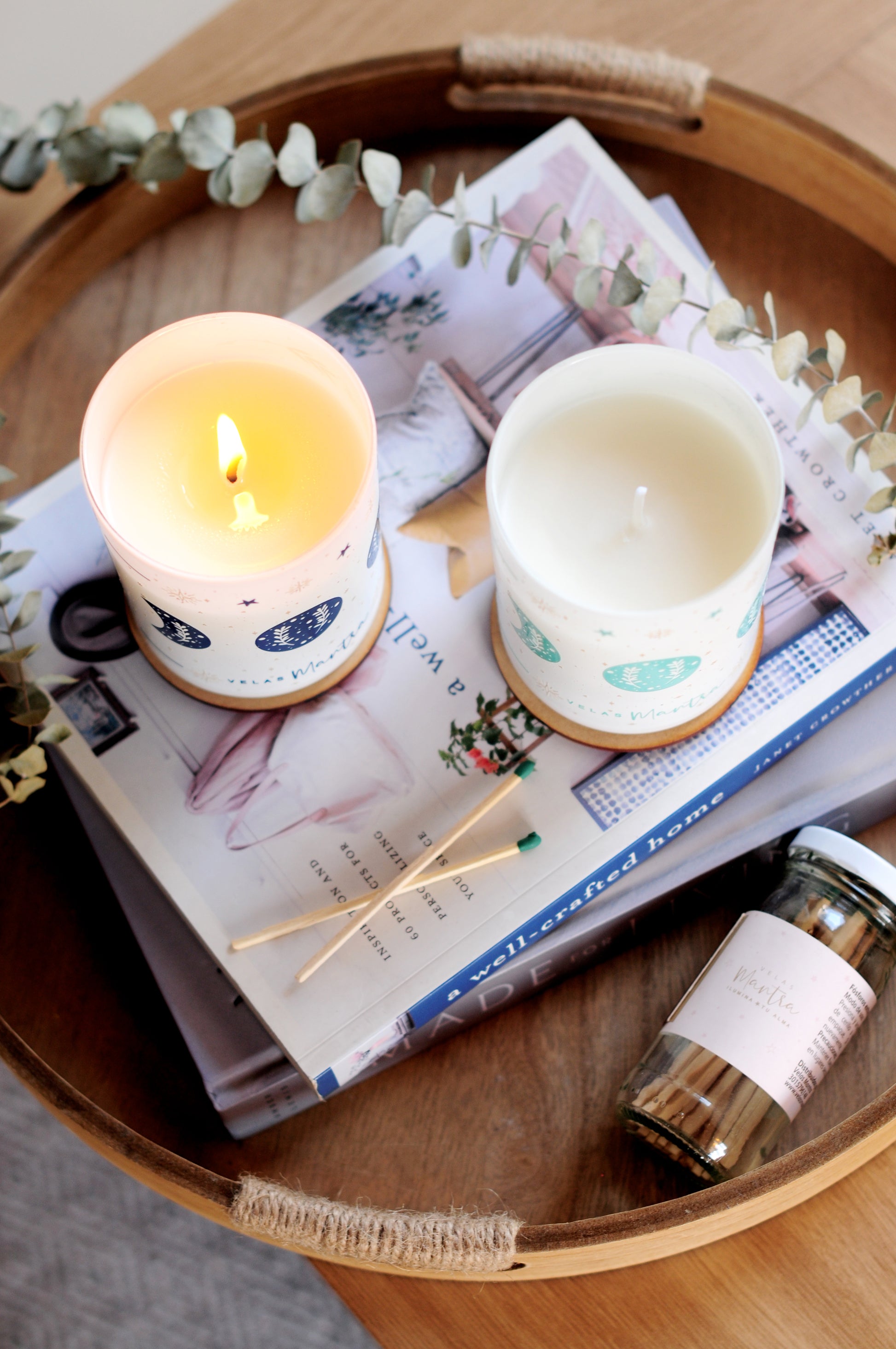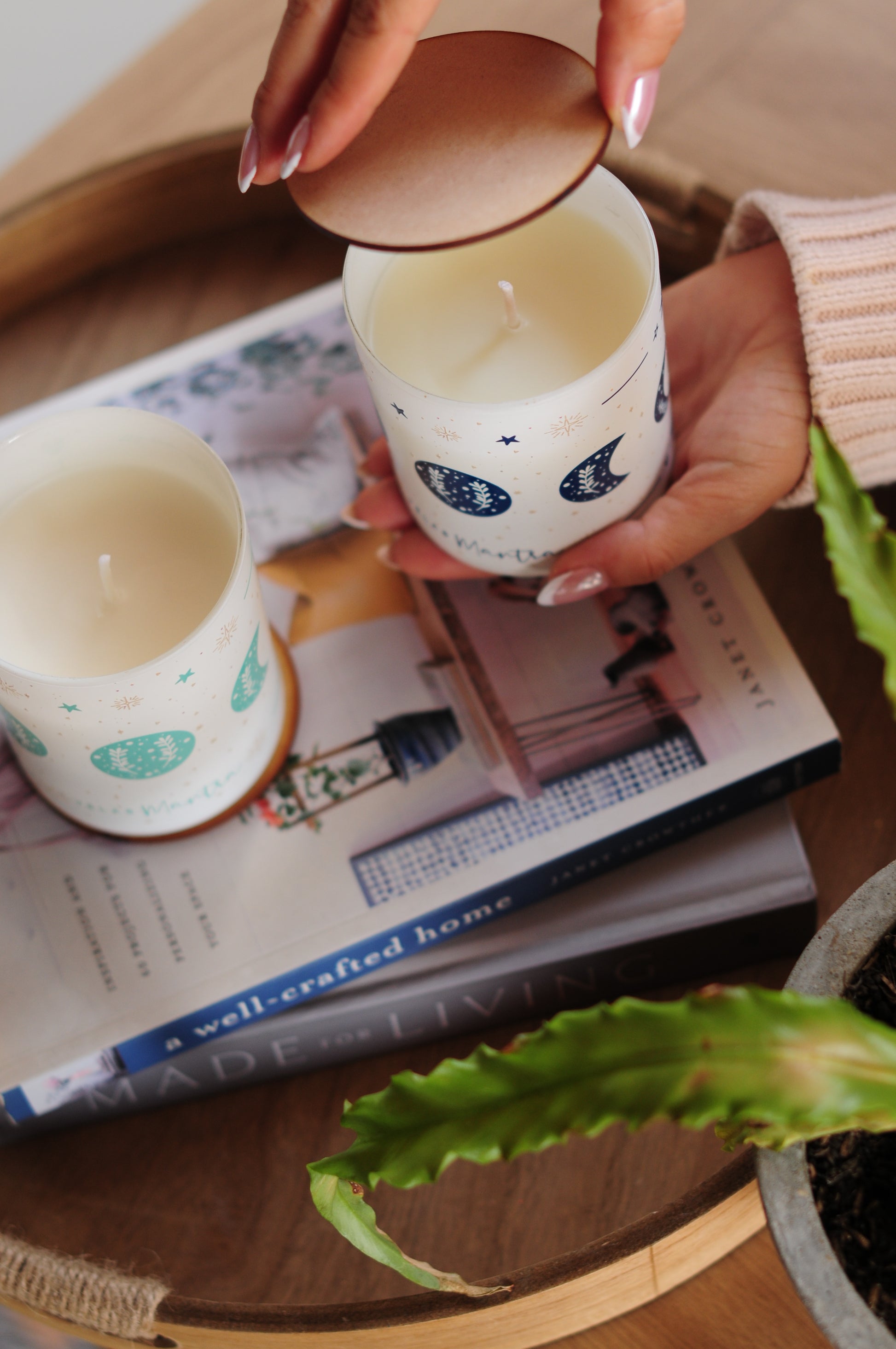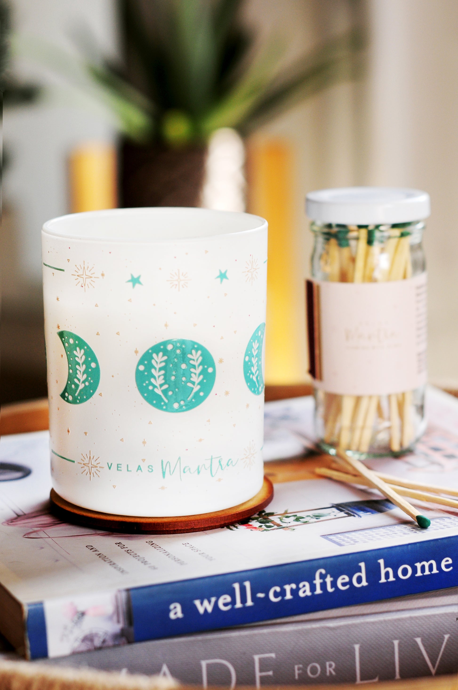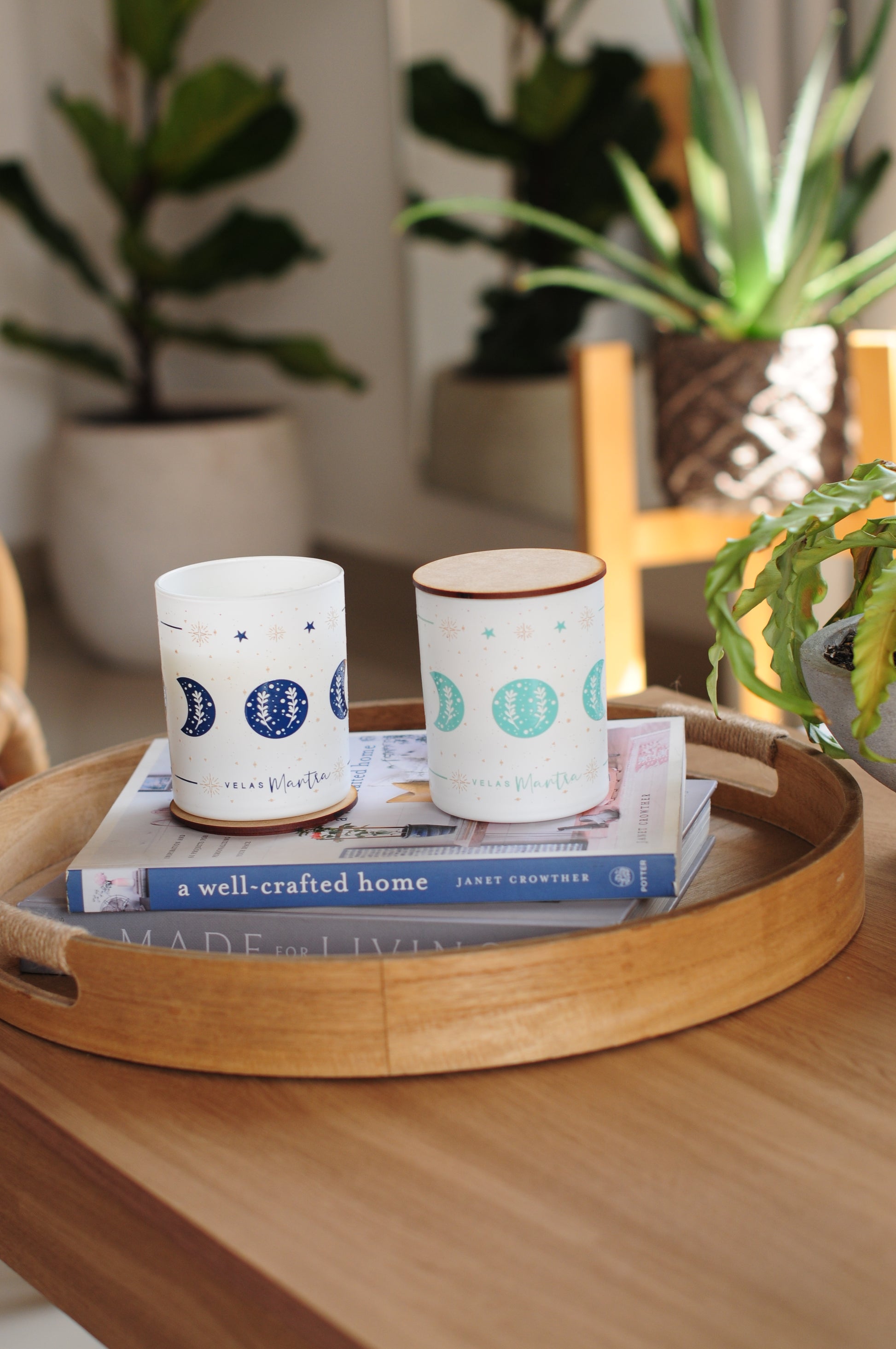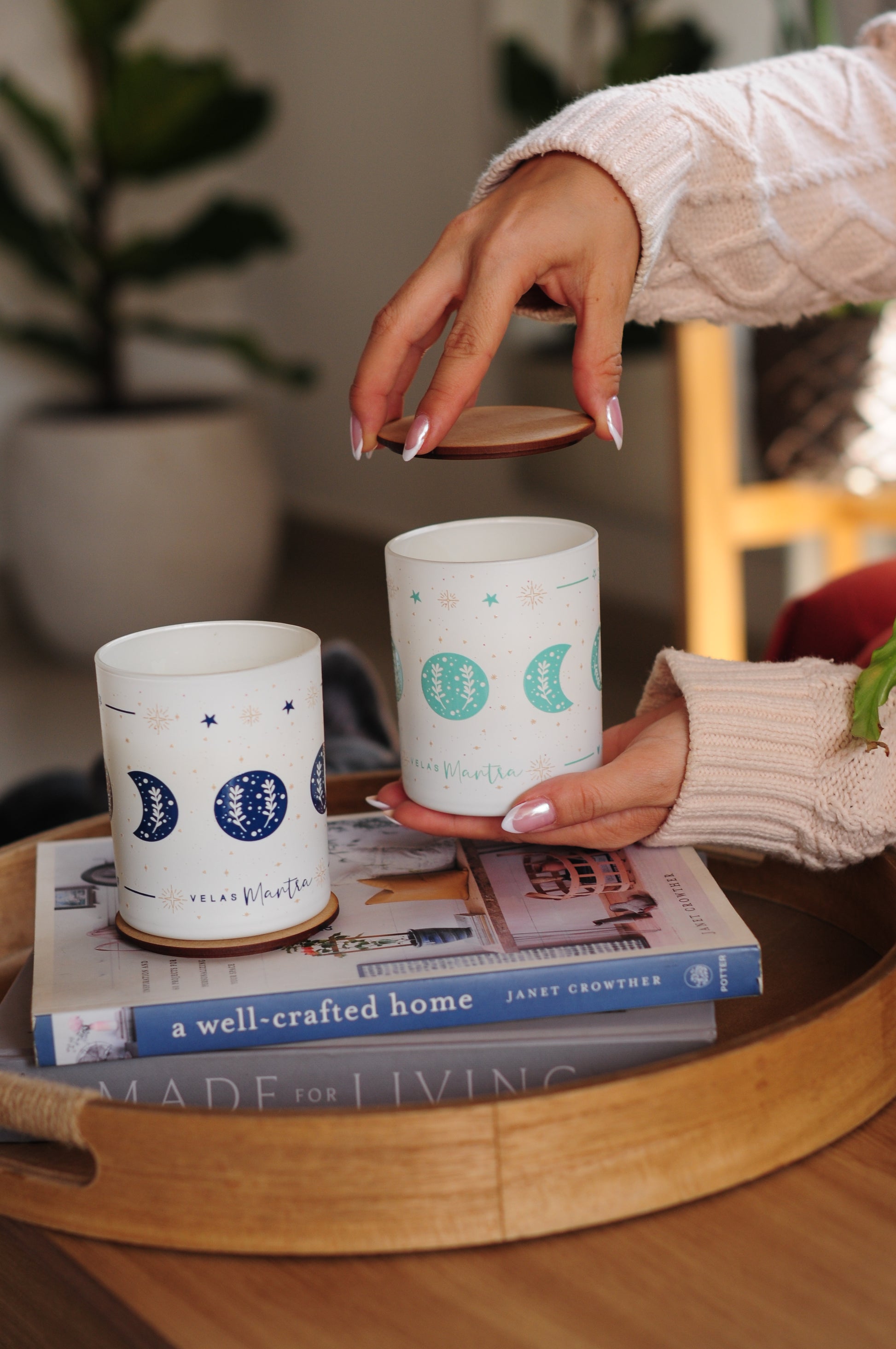 Velas aromatizantes de cera de palma, esencias para aromaterapia variadas y pabilo 100% de algodón, vaciadas en envases de cristal blanco con las fases lunares en color azul Navy o en aguamarina. Incluye tapa en mdf.